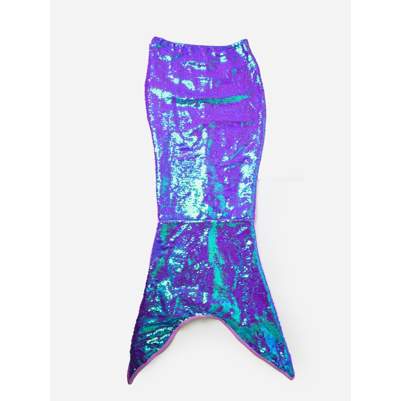 A shimmery sequin mermaid tail with an open bottom for easy navigation on land and in water.