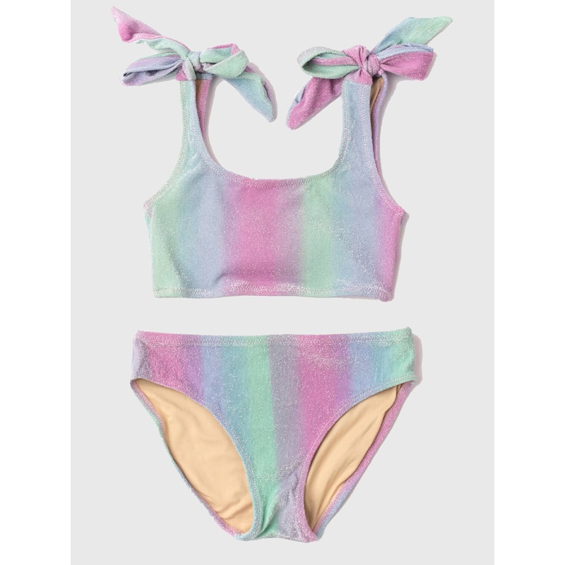 DESCRIPTION:This fun bikini features soft, shimmery fabric that catches the sunlight, creating a dazzling, ever-changing ombre effect. It's sure to be her new favorite swimsuit.FEATURES:Scoop NecklineSelf-Tie StrapsMatching BottomModerate CoverageUPF 50+ S