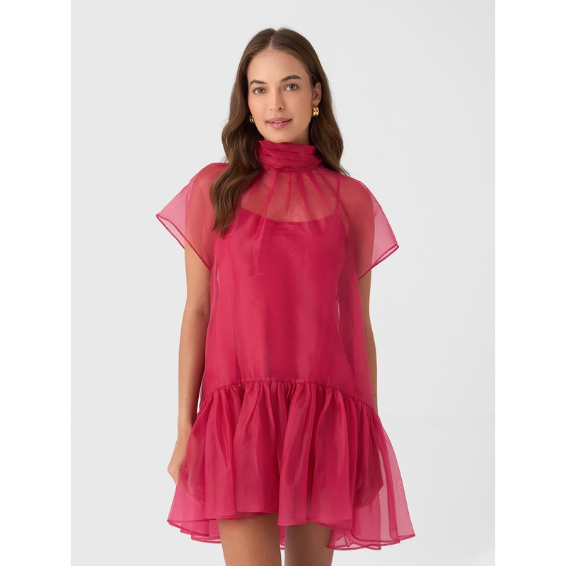 DESCRIPTION:This incredibly feminine design boasts an elegant tiered silhouette, ethereal sheer layers, and a sophisticated high-neck tie, blending romance with timeless charm.FEATURES:High NecklineBack Tie DetailRuffle HemCamisole Slip LiningMini Silhouet