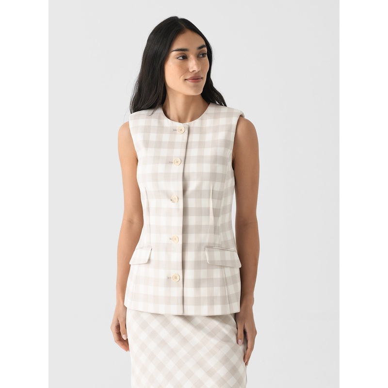 DESCRIPTION:This tailored vest features a classic yarn-dyed gingham pattern and a flattering peplum silhouette that accentuates your waist.FEATURES:Round NecklineButton-Down FrontFlap PocketsAll-Over Gingham Print58% Viscose, 40% Polyester, 2% SpandexTailo