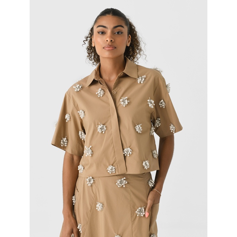 Crafted from crisp cotton poplin, this button-front shirt features relaxed sleeves and a boxy shape for modern comfort. A spread collar and all-over embellishments complete its stylish design.