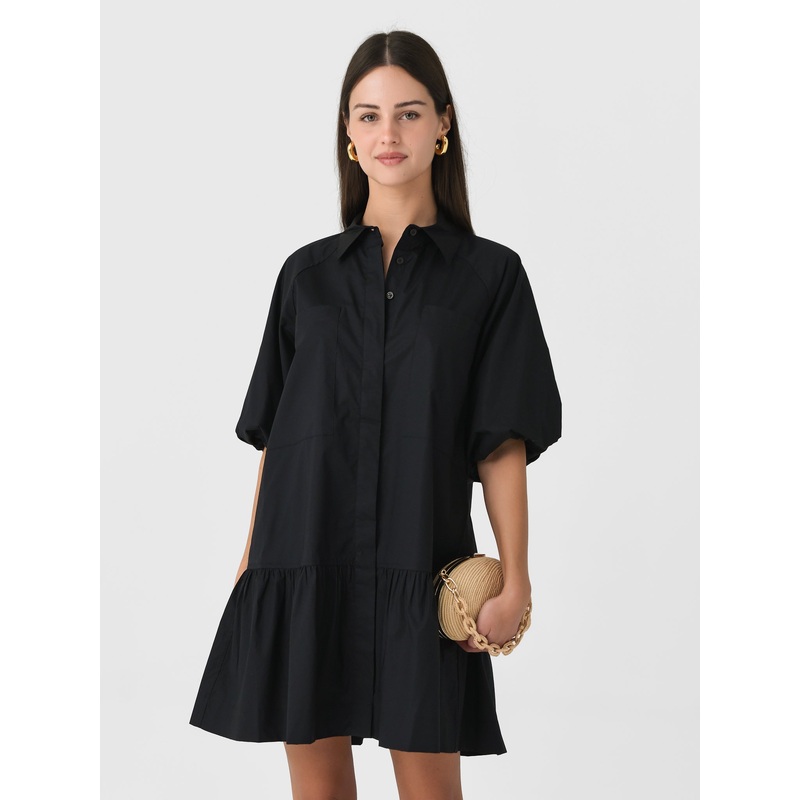 DESCRIPTION:A lightweight poplin mini dress featuring puff sleeves, a hidden placket, and a ruffle hem.FEATURES:Spread CollarChest PocketsPuff SleevesHidden Button PlacketDrop WaistRuffle HemMini Silhouette97% Cotton, 3% SpandexRelaxed FitModel is wearing