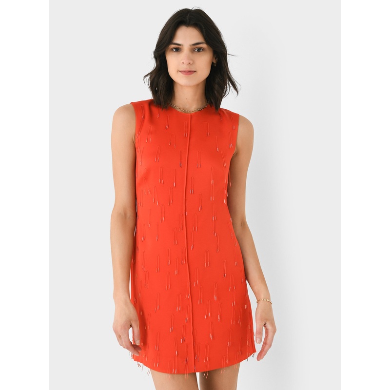 A bright, sleeveless mini dress with a shift silhouette and all-over embellished detailing.
