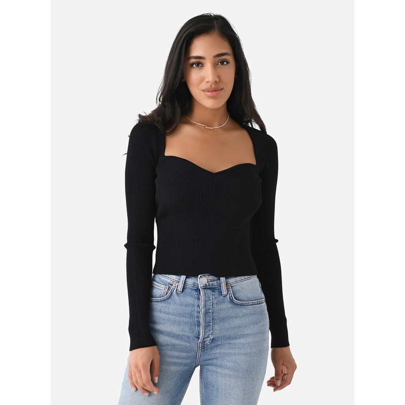 DESCRIPTION:Compact ribbed knit top with a sweetheart neckline and a fitted silhouette.FEATURES:Sweetheart NecklineLong SleeveStraight HemRibbed Knit Fabrication80% Rayon 20% NylonSlim FitModel is wearing size Small top.Model's Measurements: Height: 5'8" |