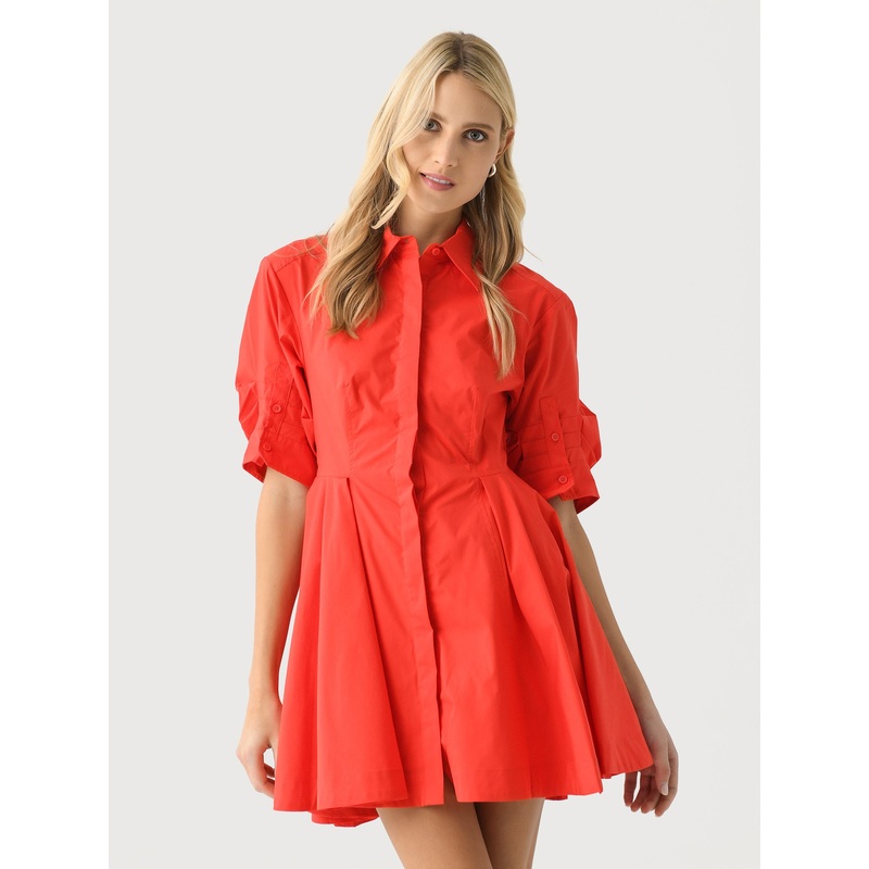 DESCRIPTION:An elevated shirtdress made from a lightweight cotton blend with half-length sleeves and a gathered skirt.FEATURES:Spread CollarHalf-Length Puff SleevesHidden Button PlacketGathered SkirtMini Silhouette63% Cotton, 37% PolyesterClassic FitModel