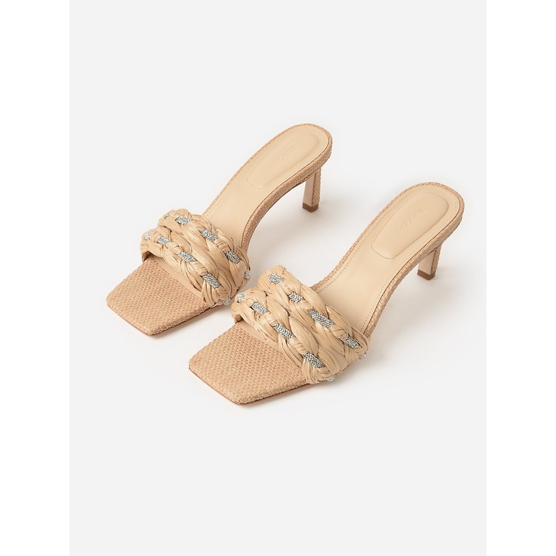 DESCRIPTION:A leather sandal with a braided raffia strap and mid-heel design.