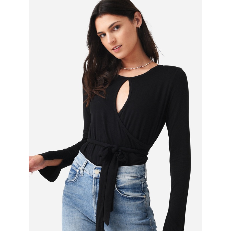 Long sleeve top with a keyhole detail and a wrap silhouette.