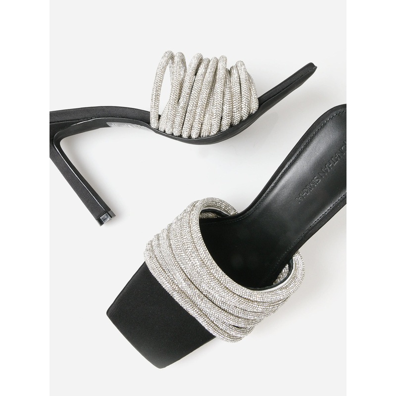 DESCRIPTION:Crystal-embellished multi-strap mule heels.