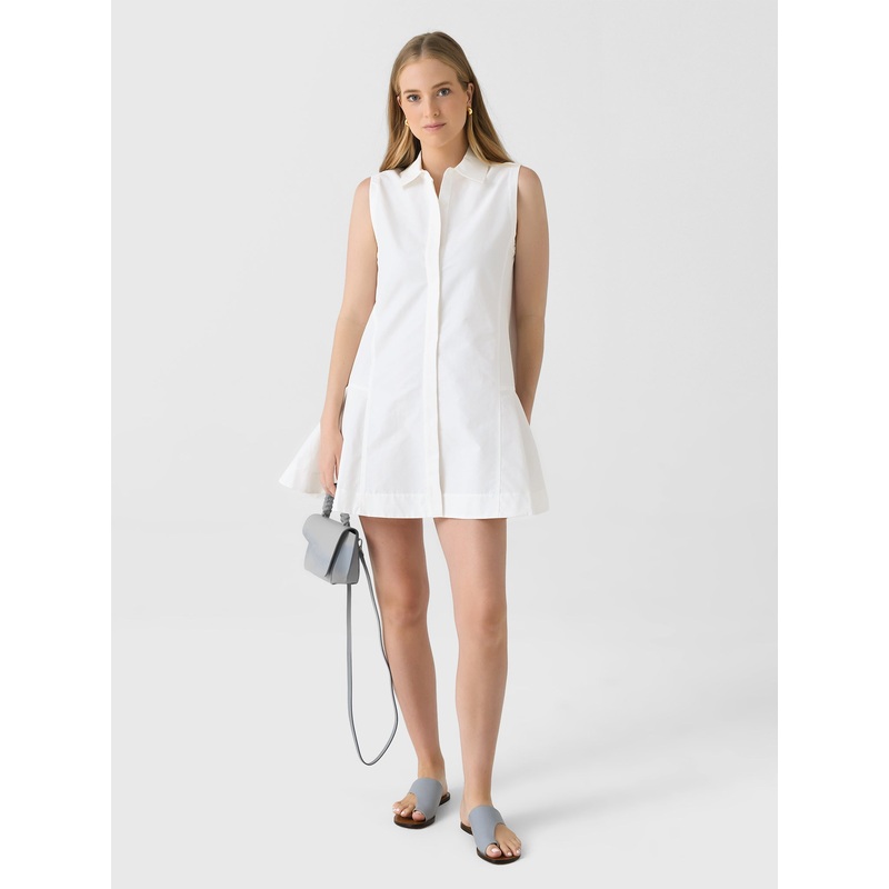 DESCRIPTION:A structured, sleeveless mini dress with a collared neckline, hidden button placket, and subtle flared hem.FEATURES:Spread CollarSleevelessHidden Button ClosureStitched DetailsFlare HemMini Silhouette62% Cotton, 38% PolyamideClassic FitModel is
