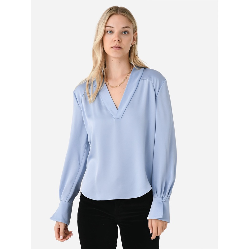 DESCRIPTION:A v-neck blouse with feminine blouson sleeves made from soft satin fabric.FEATURES:V-NecklineBlouson SleevesButton CuffsCurved HemSatin Fabrication89% Acetate, 11% PolyesterClassic FitModel is wearing size 2 blouse.Model's Measurements: Height: