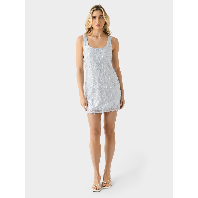 DESCRIPTION:A beautiful mini dress constructed from an outer lace layer embellished with crystals and sequins.FEATURES:Square NecklineFixed StrapsZip ClosureAll-Over EmbellishmentsMini SilhouettePolyester BlendClassic FitModel is wearing size 4 dress.Model