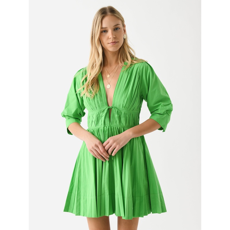 DESCRIPTION:A lightweight mini dress with a plunging neckline and a soft pleated design that flows into a whimsical skirt.FEATURES:Self-Tie NecklineHalf-Length Puff SleevesSide Zip ClosurePleated ConstructionFull SkirtMini Silhouette63% Cotton 37% Polyeste