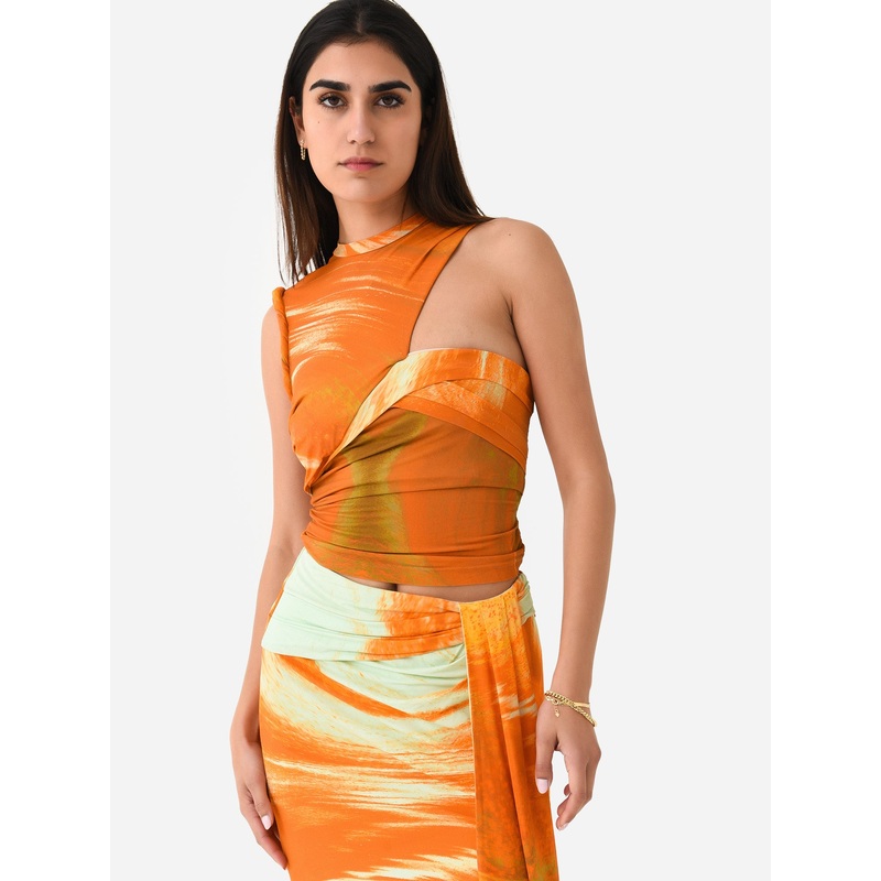 Asymmetrical sleeveless top with ruching details and a marble print.