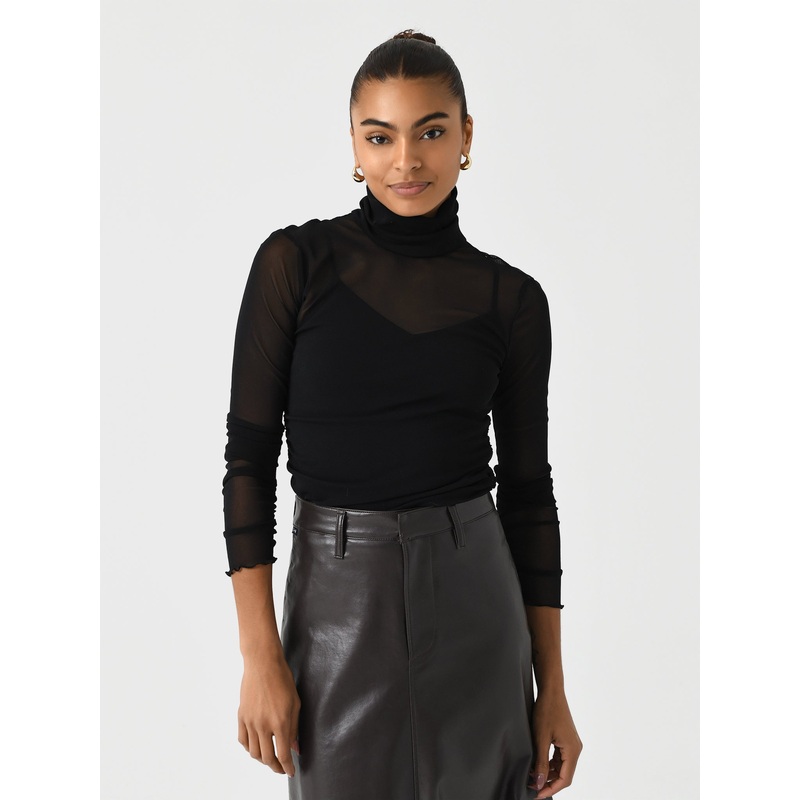 A sheer turtleneck bodysuit with a detachable camisole lining.
