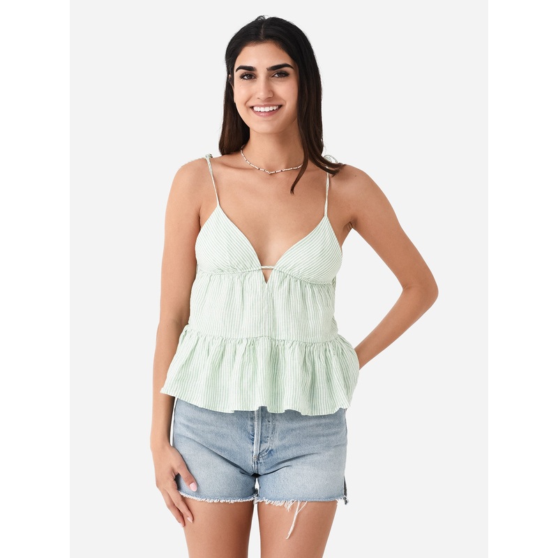 DESCRIPTION:Striped linen top with self-tie straps and a ruffle hem.FEATURES:TopV-Neckline Keyhole DetailSelf-Tie StrapsRuffle HemAll-Over Stripe PrintLightweight Fabrication100% LinenClassic FitModel is wearing size Small top.Model's Measurements: Height: