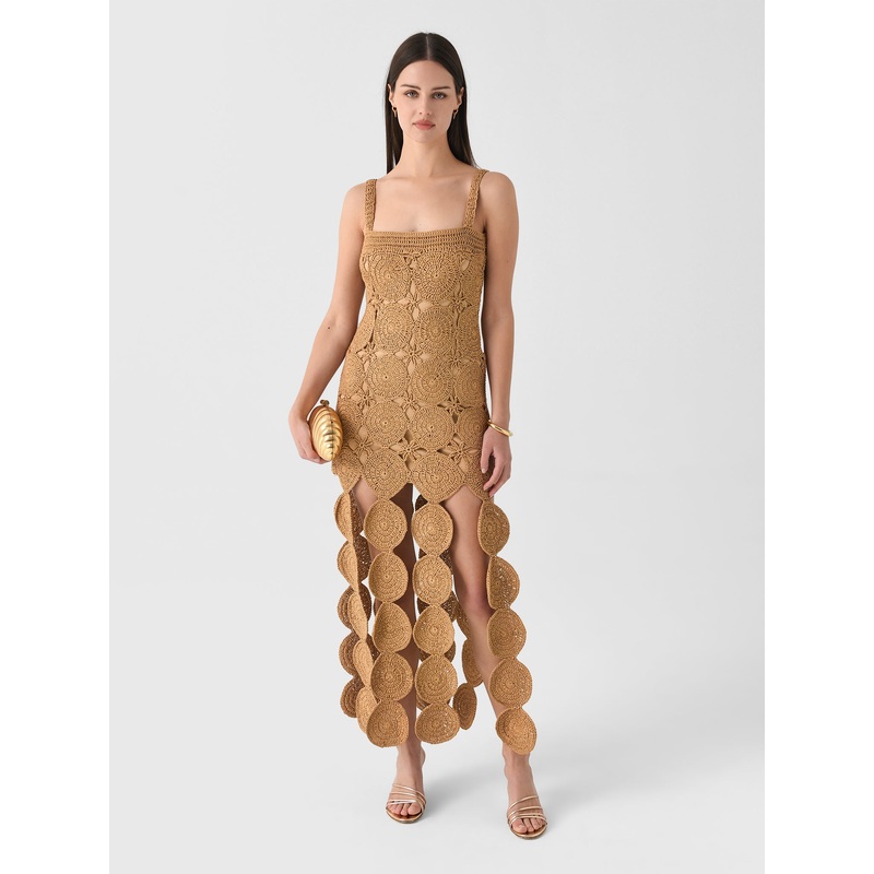 A warm weather-ready dress featuring a crocheted construction with a tonal lining and circular fringe hem.