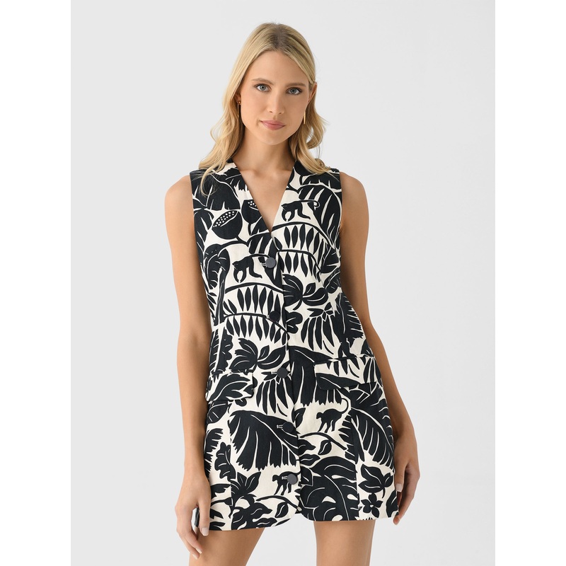 A sleeveless dress made from a lightweight linen-cotton blend with a tropical-inspired print and a front button closure.