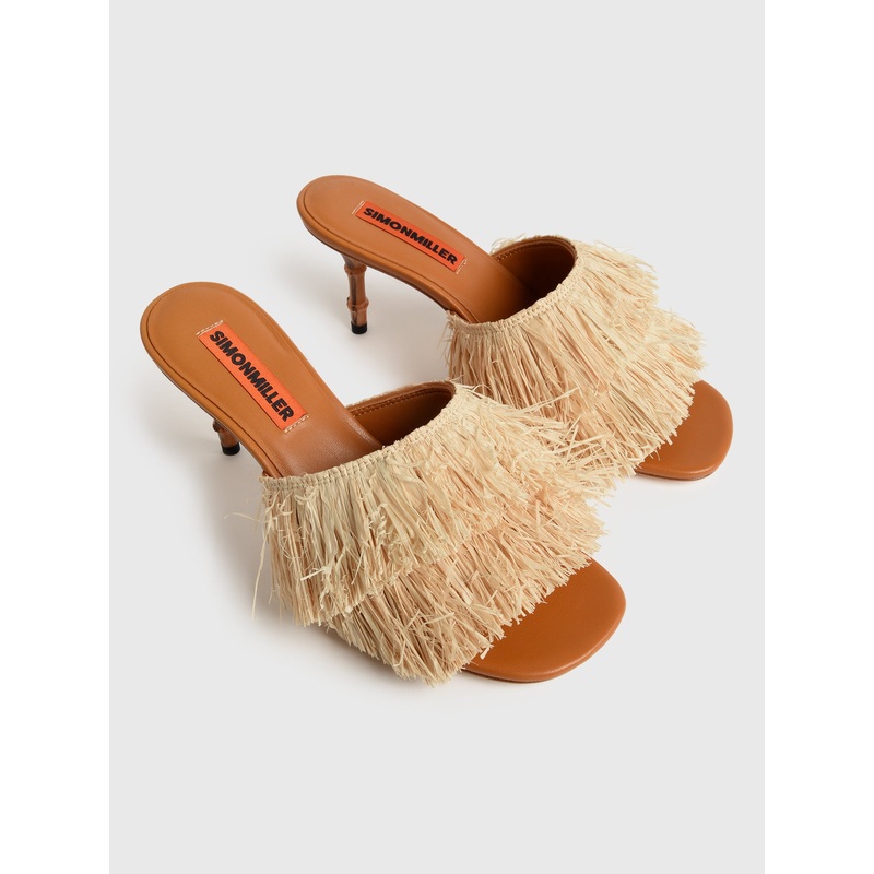 Crafted from raffia with fringe detailing, this mule features a bamboo heel and a leather sole for a comfortable and stylish look.