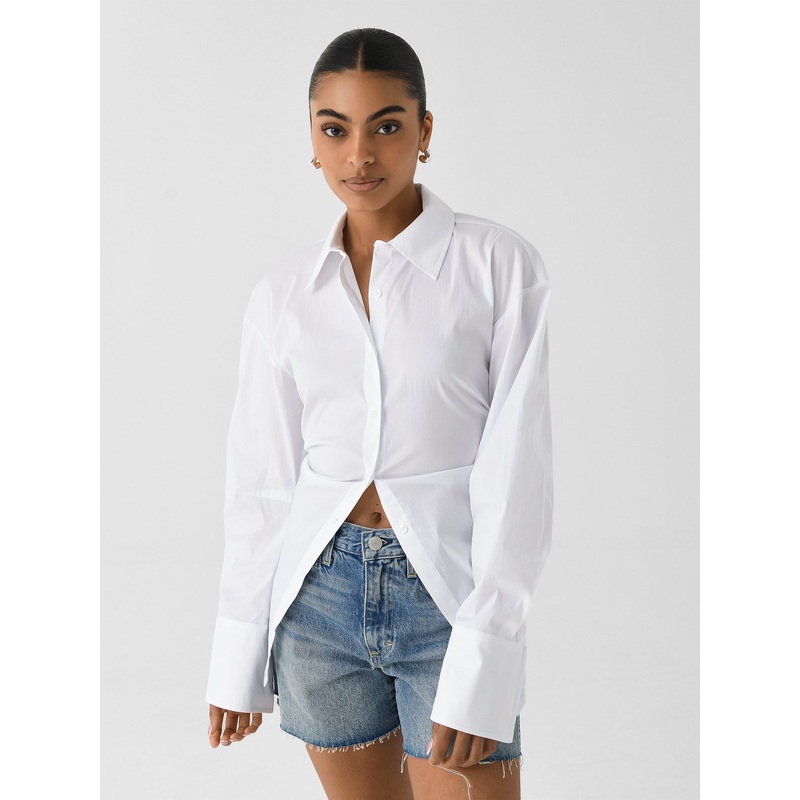 DESCRIPTION:An elevated button-down blouse made from stretch poplin fabric. It has a cut-out back and an adjustable tie closure for a versatile fit.FEATURES:Spread CollarButton CuffsButton-Down FrontOpen Back, Tie ClosureSplit HemPoplin Fabrication78% Cott