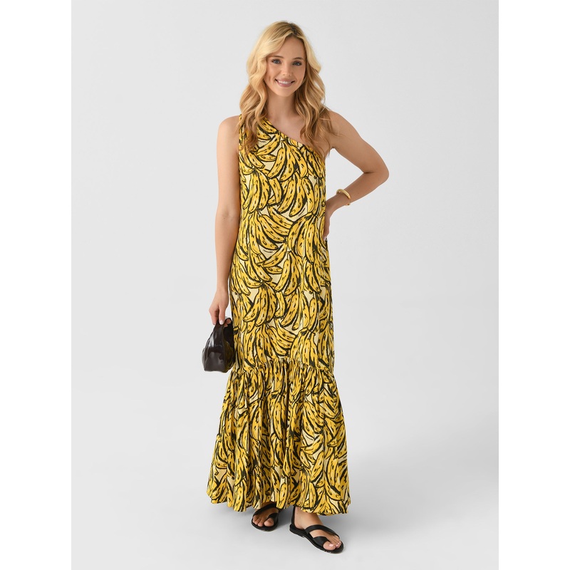 DESCRIPTION:Escape to a tropical paradise in this playful maxi dress featuring a one-shoulder neckline, a flowy tiered skirt, and a bold banana print. Made from a lightweight cotton blend, it's perfect for your next warm-weather vacation. FEATURES:One Shou