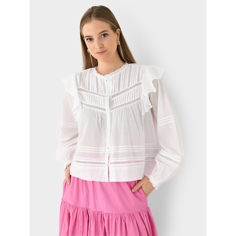 An organic cotton blouse with gathered pintucks, embroidered eyelet lace, and ruffle details.