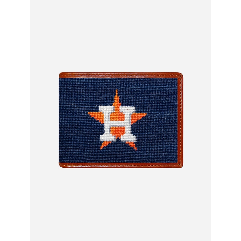 A bi-fold wallet made from full-grain leather with a Houston Astros needlepoint design.