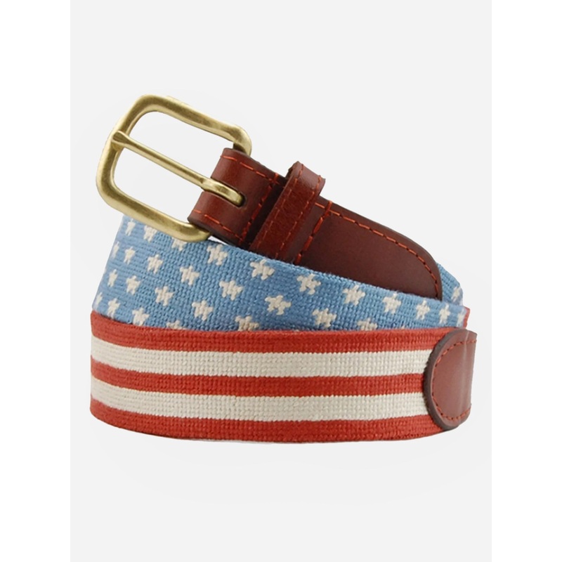 DESCRIPTION:Patriotic hand-stitched needlepoint belt with leather details.FEATURES:BeltHand-Stitched NeedlepointFull Grain, Vegetable Tanned Italian LeatherSolid Brass BuckleWidth: 1.25 in.