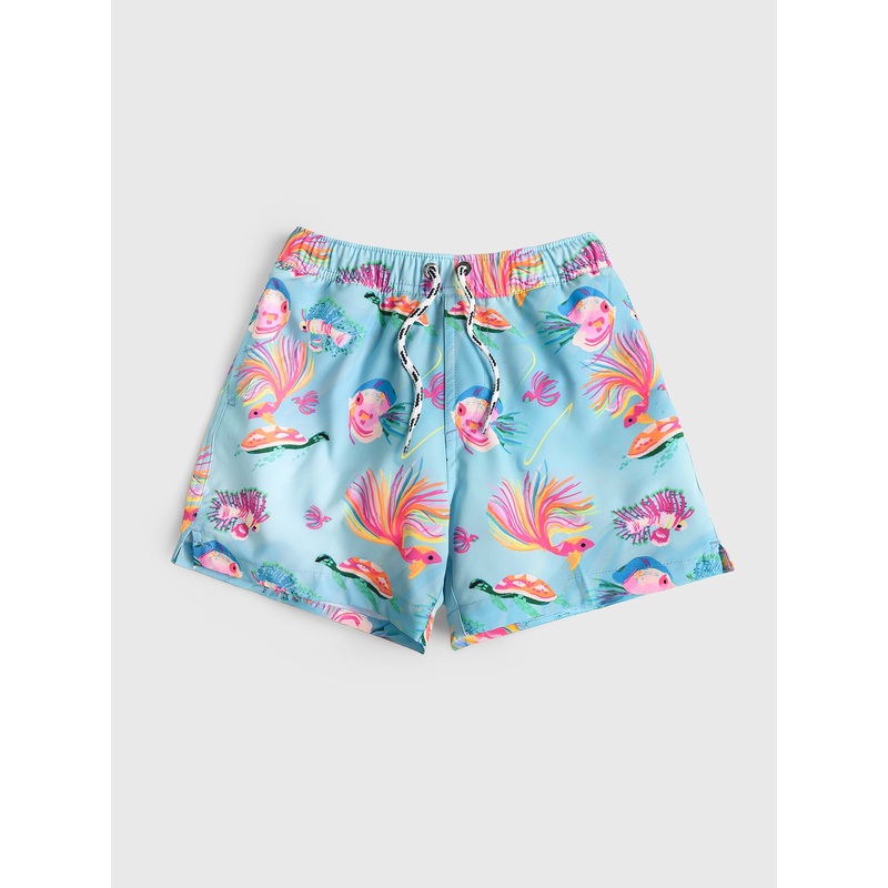 This swim trunk is made from breathable quick-drying fabric and features a colorful fish print.