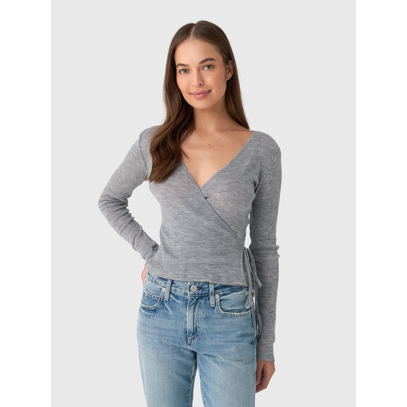 DESCRIPTION:This wrap top, made from merino wool, is a soft and versatile piece. It features a flattering V-neckline, long sleeves, and a wrap front with a tie closure. With its fine ribbed texture and subtle sheer finish, it's perfect for layering or wear