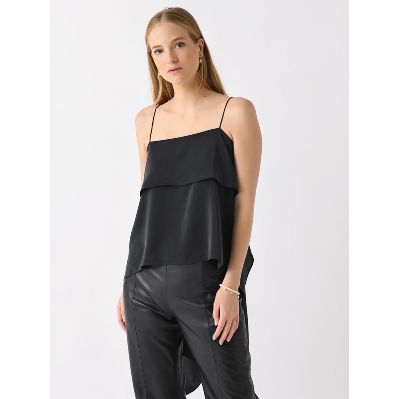 DESCRIPTION:A backless top made from silk crepe fabric with adjustable rouleau ties and back cascading draped details.FEATURES:Square NecklineThin StrapsOpen BackBack Tie ClosureCascading Drapes100% Silk CrepeClassic FitModel is wearing size XS/S top.Model