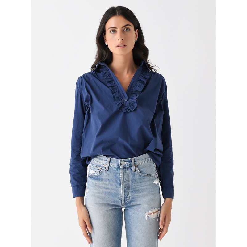 DESCRIPTION:A lightweight cotton shirt with a ruffle-trimmed neckline and gathered details throughout.FEATURES:Spread CollarV-NecklineRuffle TrimButton CuffsCurved Hem100% CottonClassic FitModel is wearing size Small shirt.Model's Measurements: Height: 5'1