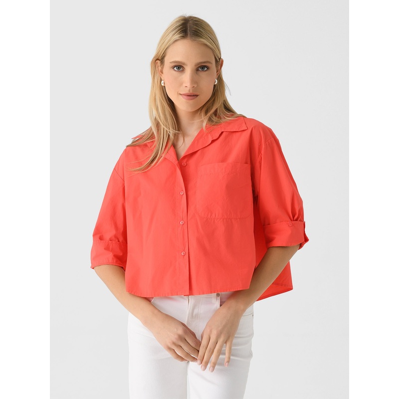 DESCRIPTION:A slightly cropped button-down blouse made from lightweight cotton.FEATURES:Spread CollarDropped ShoulderLeft Chest PocketButton CuffsButton-Down PlacketSlight Cropped Silhouette100% CottonRelaxed FitModel is wearing size Small top.Scarlet: Mod