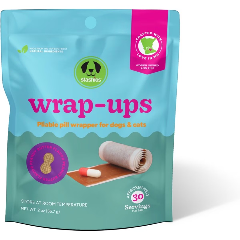 Stashios Wrap-Ups Peanut Butter FlavorWrap-Ups were created for dogs & cats, and its a perfect solution for every size and shape of pill, capsule, or tablet. Transform a pill into a treat!INGREDIENTS:Carrots, Sweet Potatoes, Honey, Brown Rice Syrup, Peanut