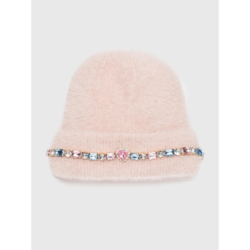 Add a touch of sparkle to chilly days with the Cotton Candy Beanie! This irresistibly fluffy pink beanie is a winter essential, featuring a gem-encrusted brim.