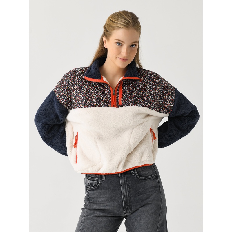 DESCRIPTION:A plush sherpa pullover featuring a color block design with a contrast floral yoke.FEATURES:Stand-Up CollarHalf-Zip ClosureZip Chest PocketContrast YokeSide Zip PocketsElastic BindingColor Block Design100% Polyester SherpaRelaxed FitModel is we