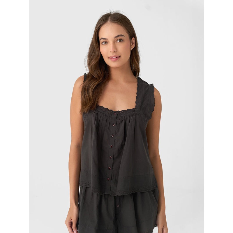 This effortlessly elegant top is crafted from soft, lightweight cotton voile for an airy, breathable feel. Designed with wide shoulder straps and a relaxed, flowy silhouette, its finished with delicate eyelet lace trim for a touch of romance. Perfectly versatile and endlessly comfortable, it transitions seamlessly from sleepwear to daytime wear.
