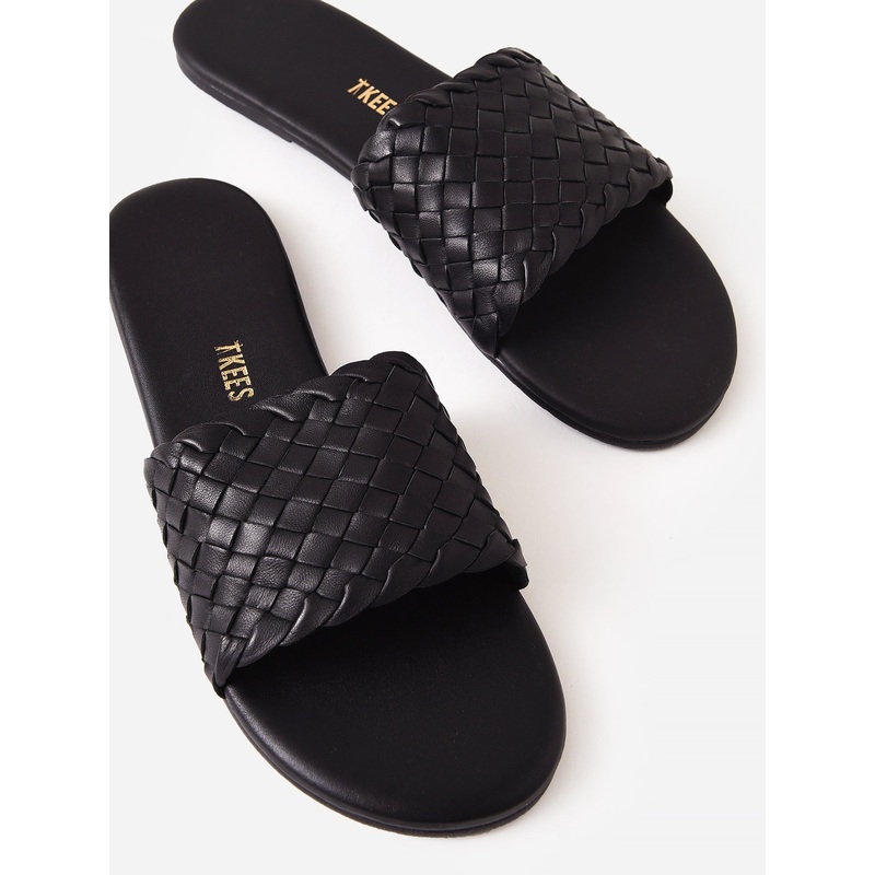 DESCRIPTION:A leather slide sandal with a woven strap and cushioned insole.