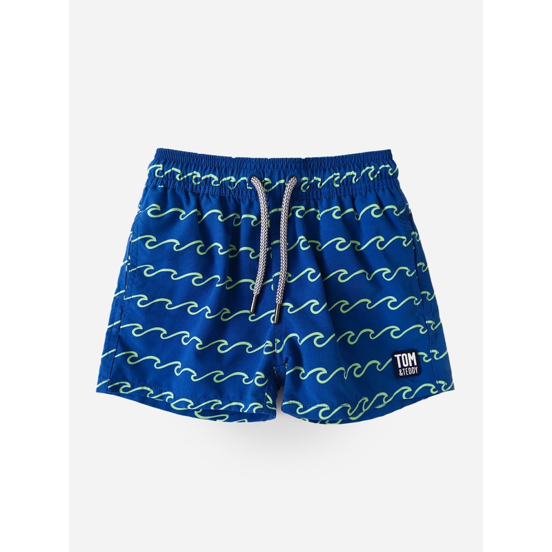 Durable, quick-drying swim trunk with a soft inner lining and custom wave print.