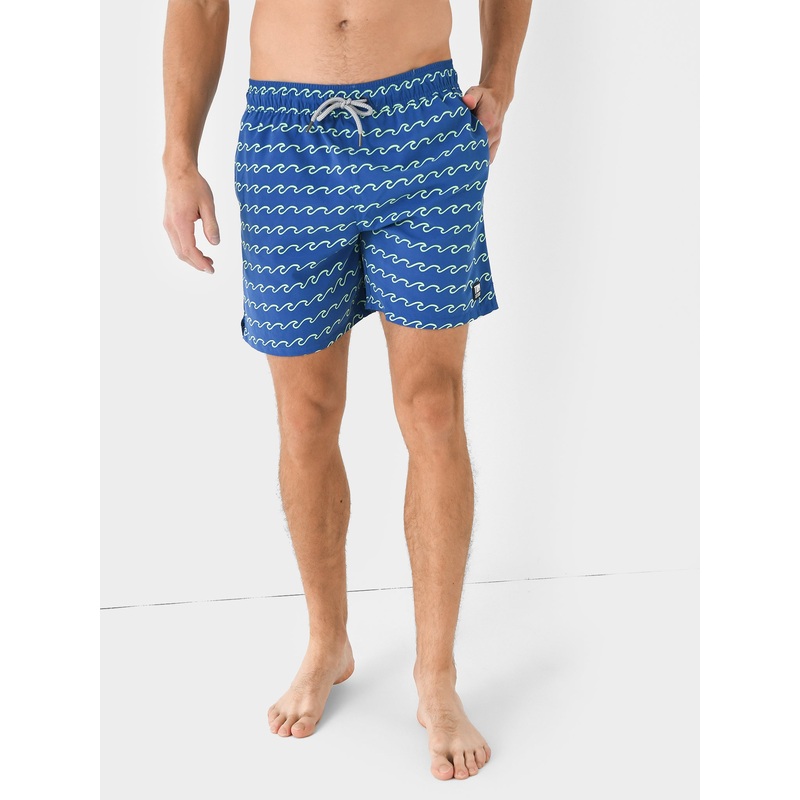 Durable, quick-drying swim trunk with added sun protection and a custom wave print.