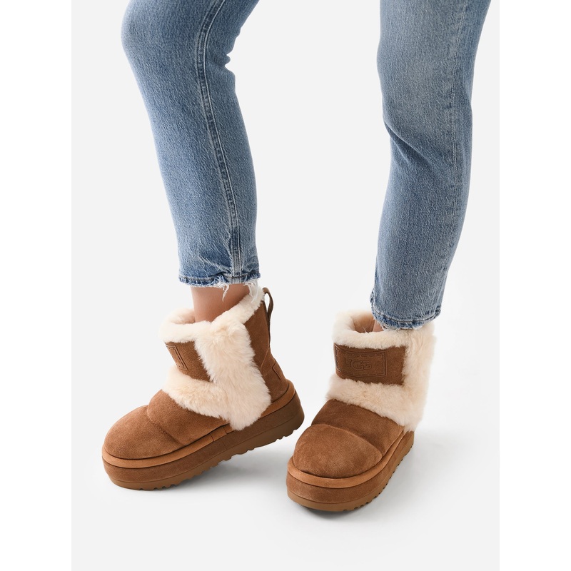 DESCRIPTION:Suede pull-on boot with wool trims and a platform sole.FEATURES:Upper: SuedeBack Pull ToeRound ToeLining & Trim: UGGpure Wool/ShearlingOutsole: EVASole Height: 2 in.