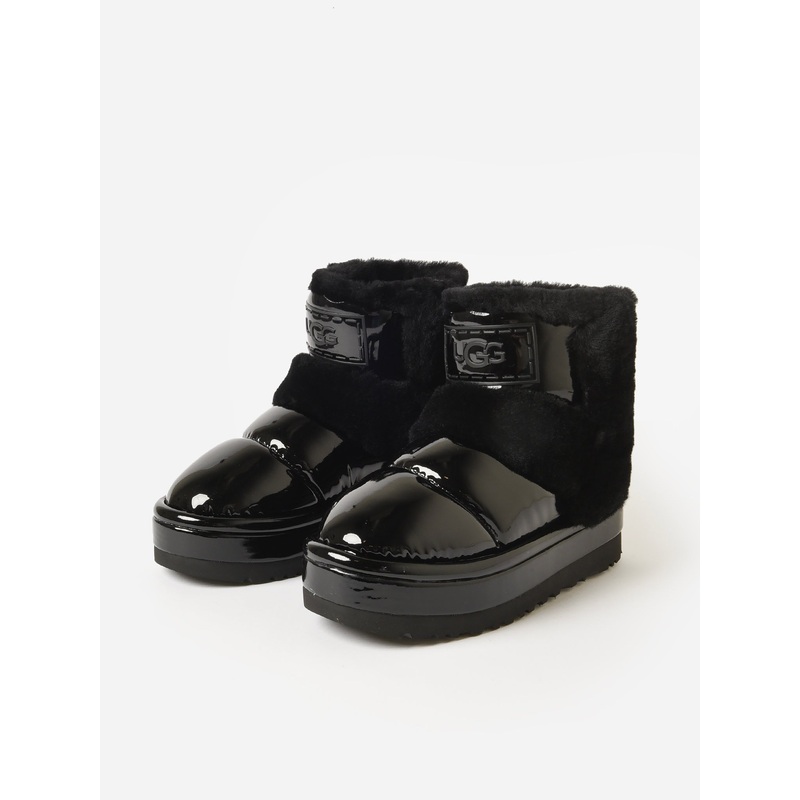 DESCRIPTION:Patent pull-on boot with wool trims and a platform sole.FEATURES:Round ToeBack Pull ToeUpper: Synthetic PatentLining & Trim: UGGpure Wool/ShearlingOutsole: EVASole Height: 2 in.