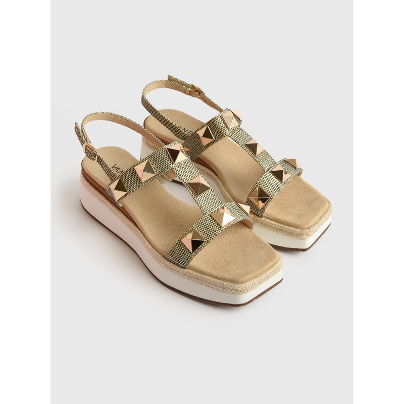 Elevate your look with this edgy flatform sandal. Featuring a t-strap design with metal pyramid studs and a jute welt, it adds a touch of rebellious cool to any outfit.