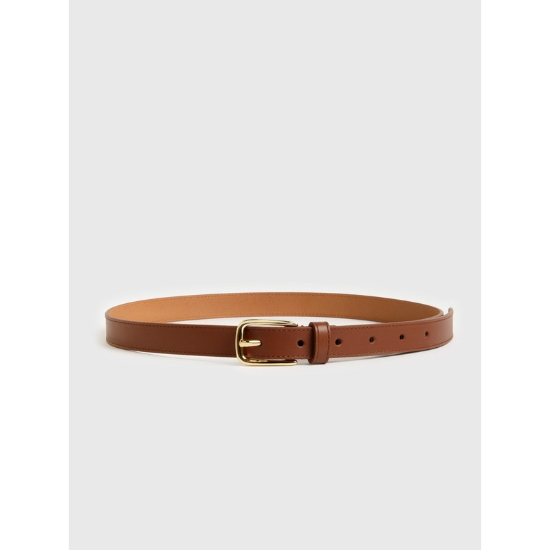DESCRIPTION: Embrace timeless sophistication with this refined leather belt. Made from supple calfskin, it exudes elegance with its clean lines and minimalist gold buckle.