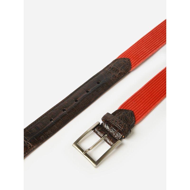 DESCRIPTION:Woven belt with a brushed nickel buckle and crocodile leather details.