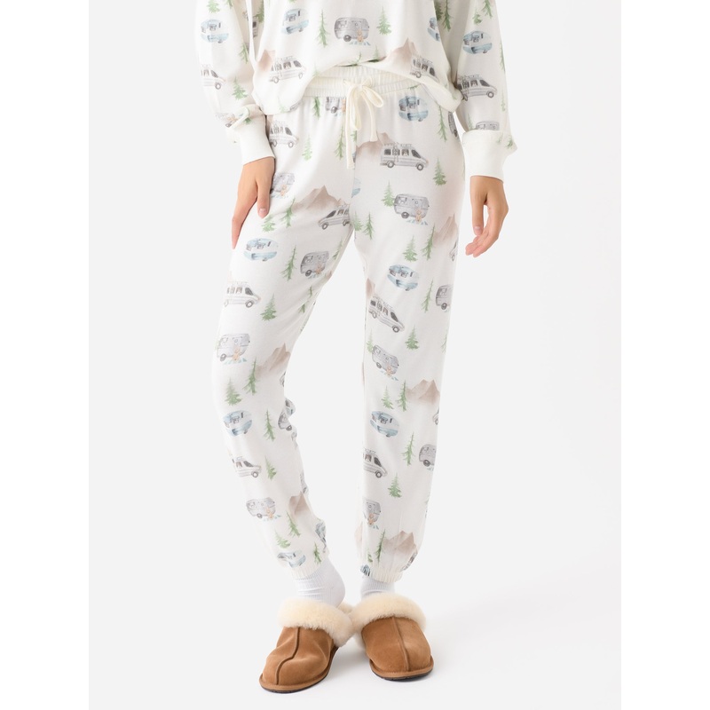 A cozy brushed knit pajama pant with a cute camper and dog print.