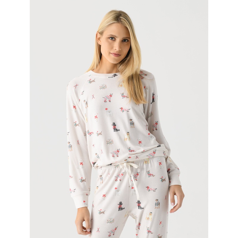 DESCRIPTION:A cozy pajama top made from brushed sweater knit fabric and finished with a festive dog print.FEATURES:Round NecklineRaglan SleevesBanded Cuffs and HemAll-Over Novelty PrintBrushed Sweater Knit62% Polyester, 33% Rayon, 5% SpandexClassic FitMode
