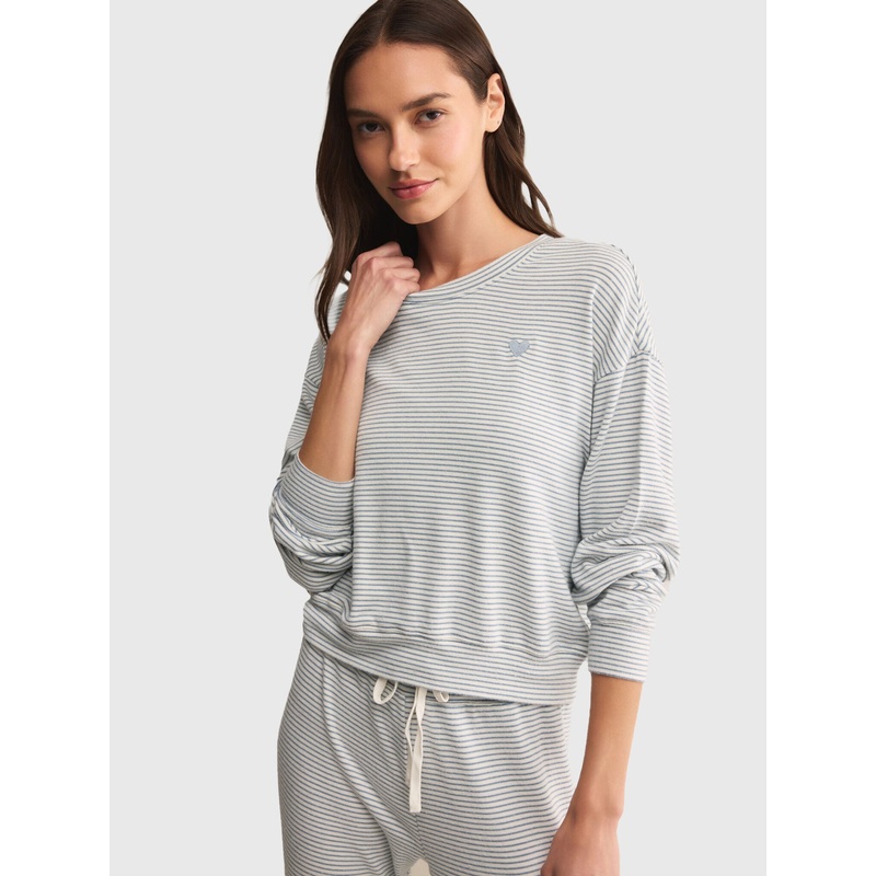A relaxed pajama top made from soft and cozy brushed sweater fabric and finished with an embroidered heart detail and a striped print.