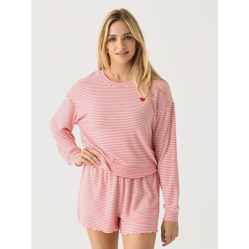 DESCRIPTION:A relaxed pajama top made from a cozy brushed sweater knit.FEATURES:Crew NecklineDropped ShoulderBanded Cuffs and HemAll-Over Stripe PrintBrushed Sweater Knit62% Polyester, 34% Rayon, 4% SpandexRelaxed FitModel is wearing size Small top.Model's