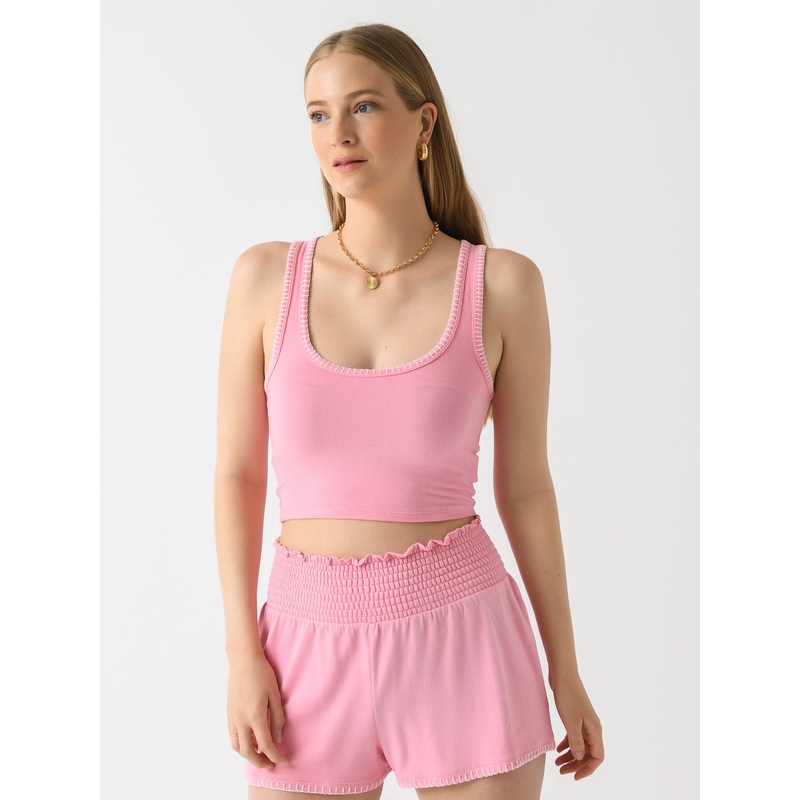 A fitted tank top made from silky ribbed fabric with contrast whipstitch trims.