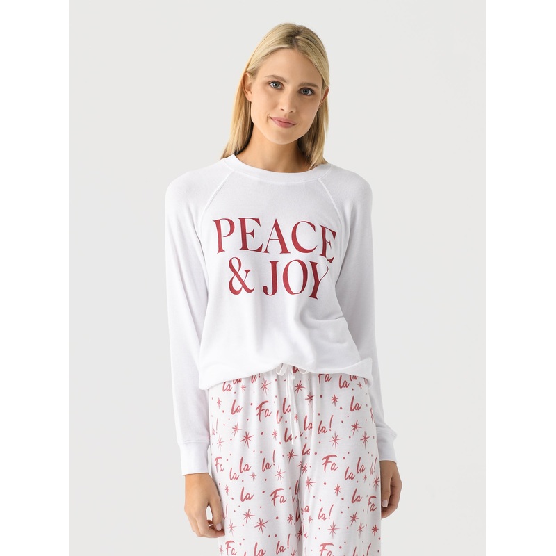 DESCRIPTION:A raglan top made from incredibly soft knit fabric and finished with a festive front graphic.FEATURES:Crew NecklineRaglan SleevesFront GraphicBanded Cuffs and HemKnit Fabrication62% Polyester, 34% Rayon, 4% SpandexClassic FitModel is wearing si